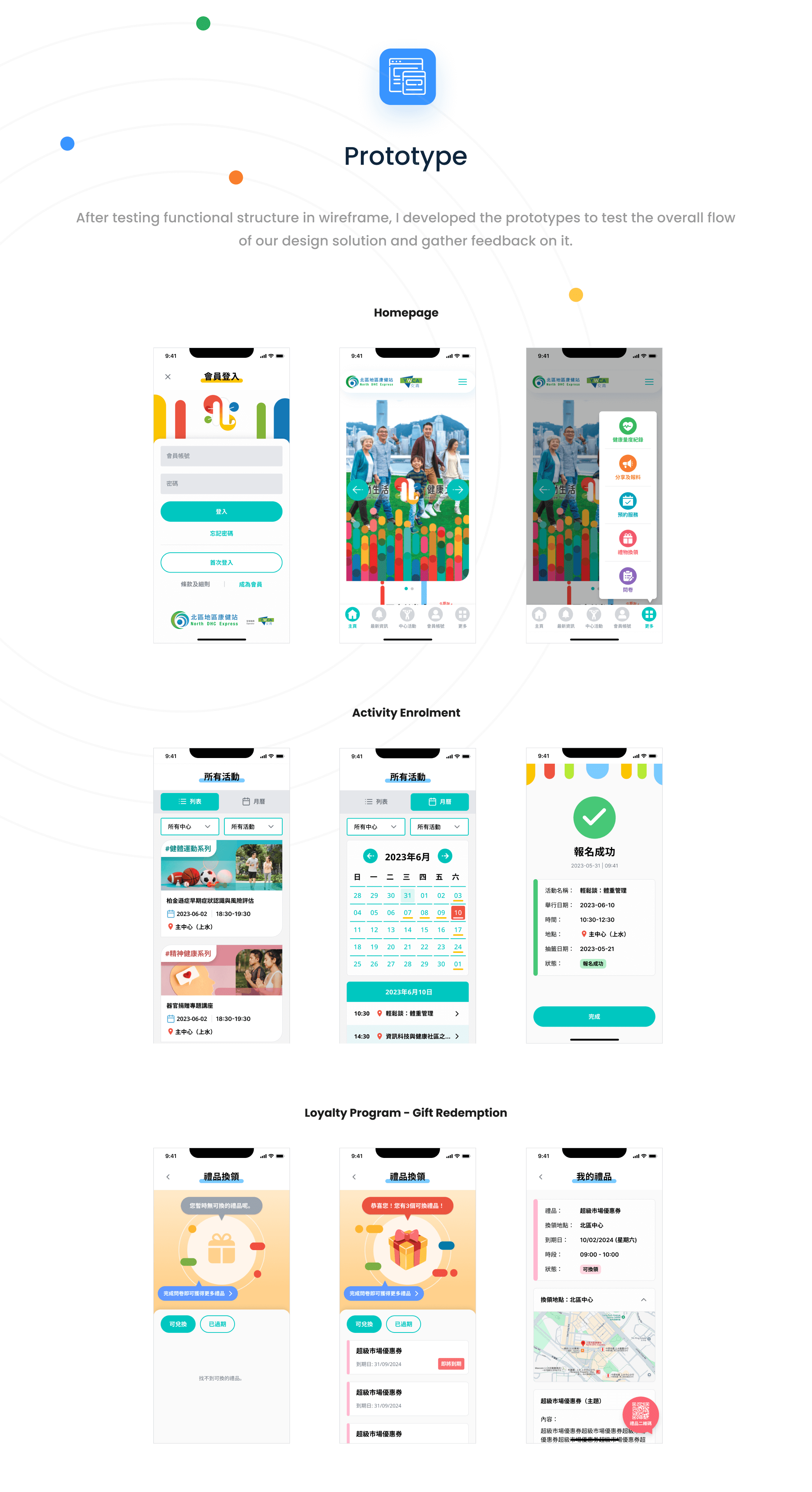 Designed a cohesive and integrated app featuring membership, programme booking, and health management from 0 to 1 — leading the process from user research and prototyping to final design and development handoff.