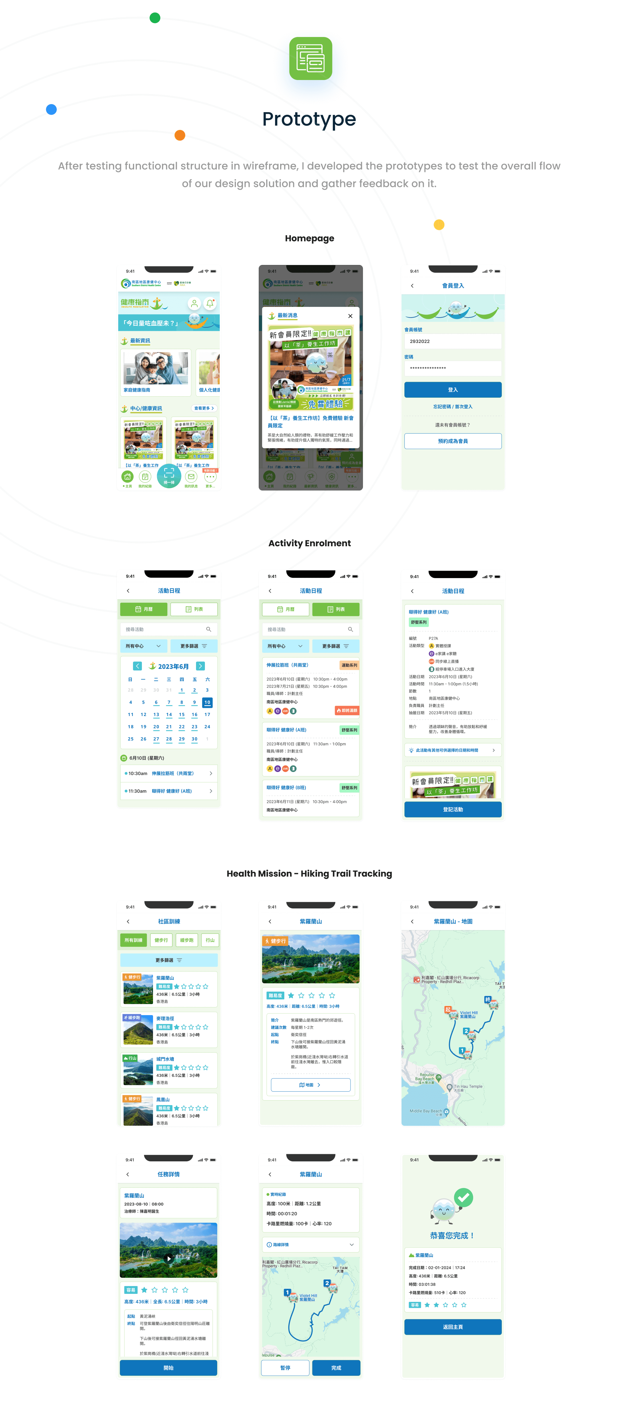 Designed a user-engaging and integrated app featuring membership, programme booking, and health management from 0 to 1 — leading the process from pitching, user research and prototyping to final design and development handoff.